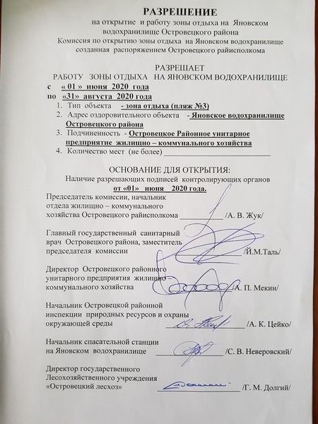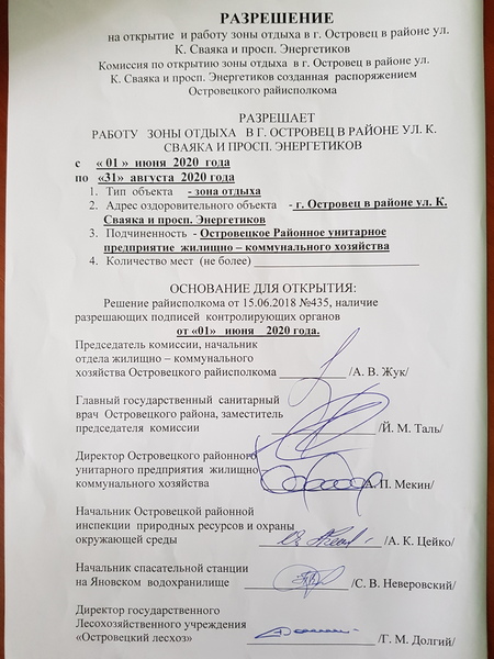 На основании решения Островецкого райисполкома "О подготовке зон отдыха на водных объектах к купальному сезону 2020 года и их содержанию" Островецкому РУП ЖКХ выдан разрешения на открытие и работу зоны отдыха в г. Островец в районе ул. К. Сваяка и просп. Энергетиков и зоны отдыха на Яновском водохранилище Островецкого района.